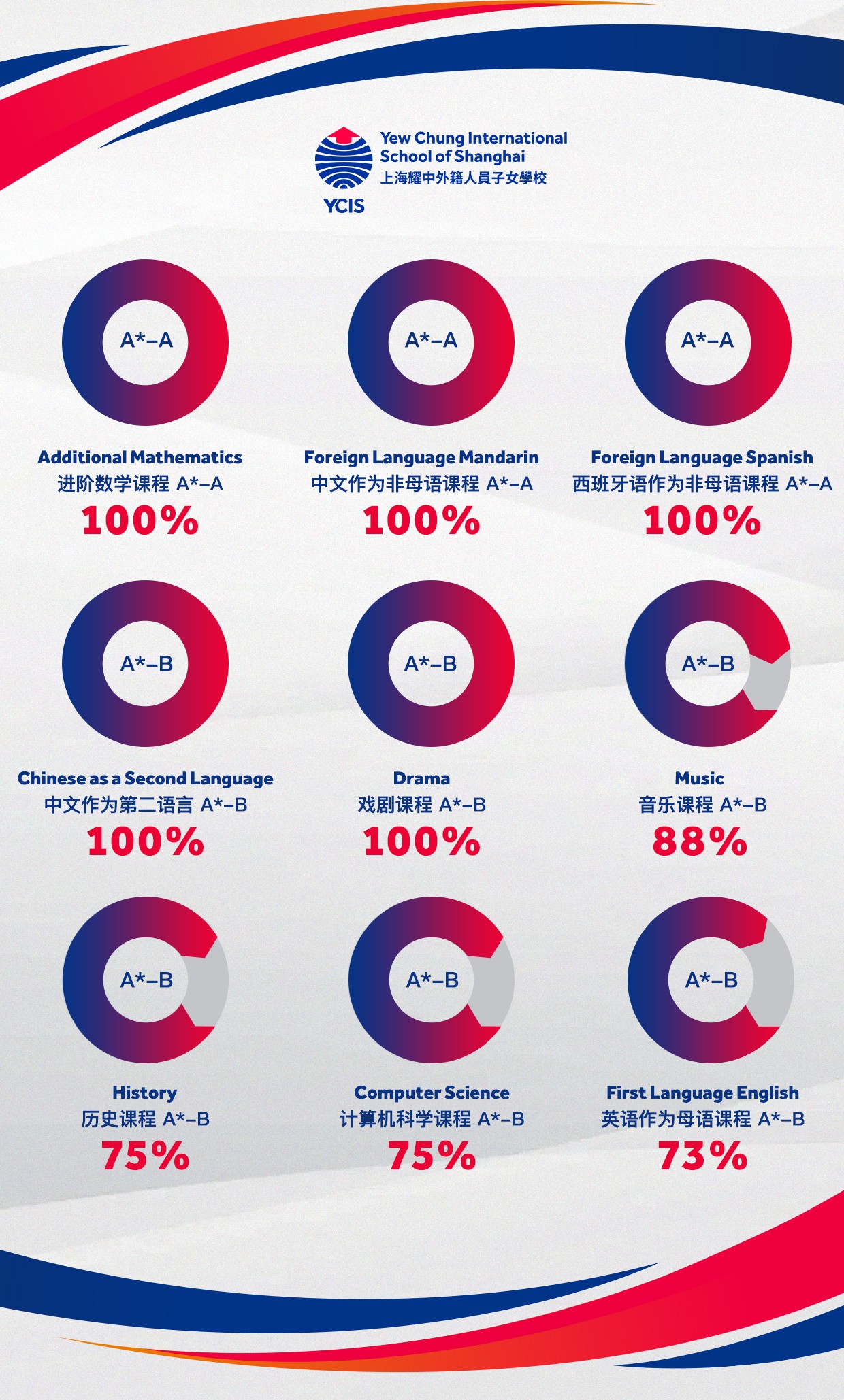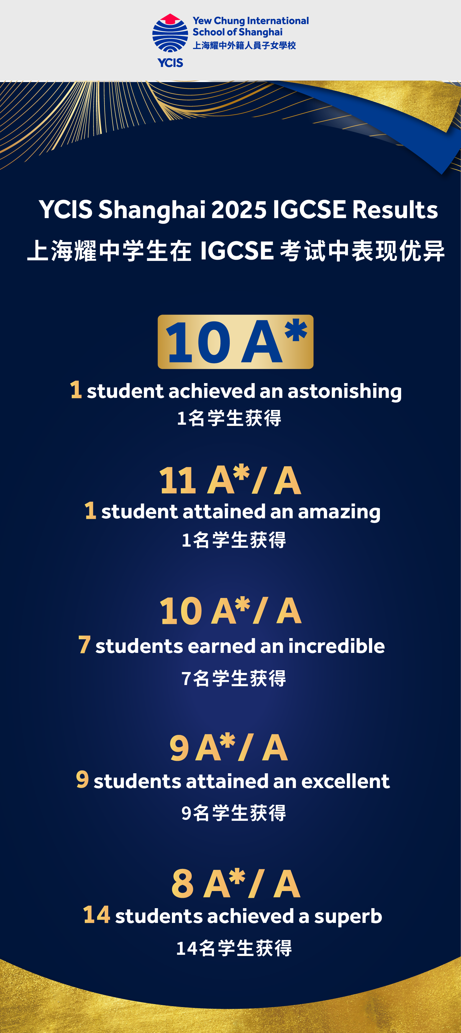 在新学年开启之际,我们非常高兴地宣布,在2025年国际中学教育普通证书课程(IGCSE)的考试中,上海耀中的学子们取得了优异的成绩:约一半的成绩为A*- A,四分之三的成绩为A*- B!